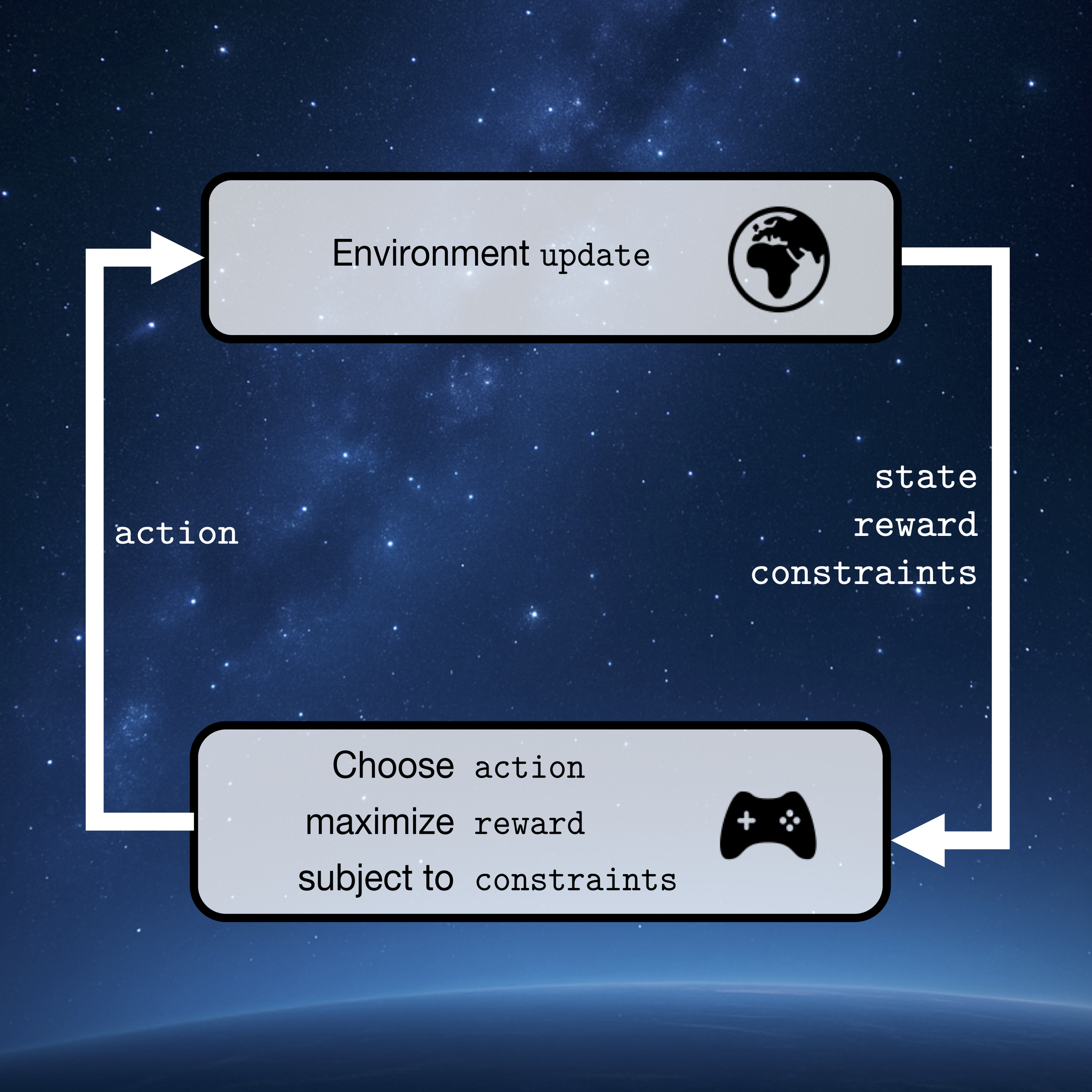 We have an intelligent agent that reads the state of its environment (the screenshot of your video game). Based on the state, the agent takes an action (the buttons of your controller).